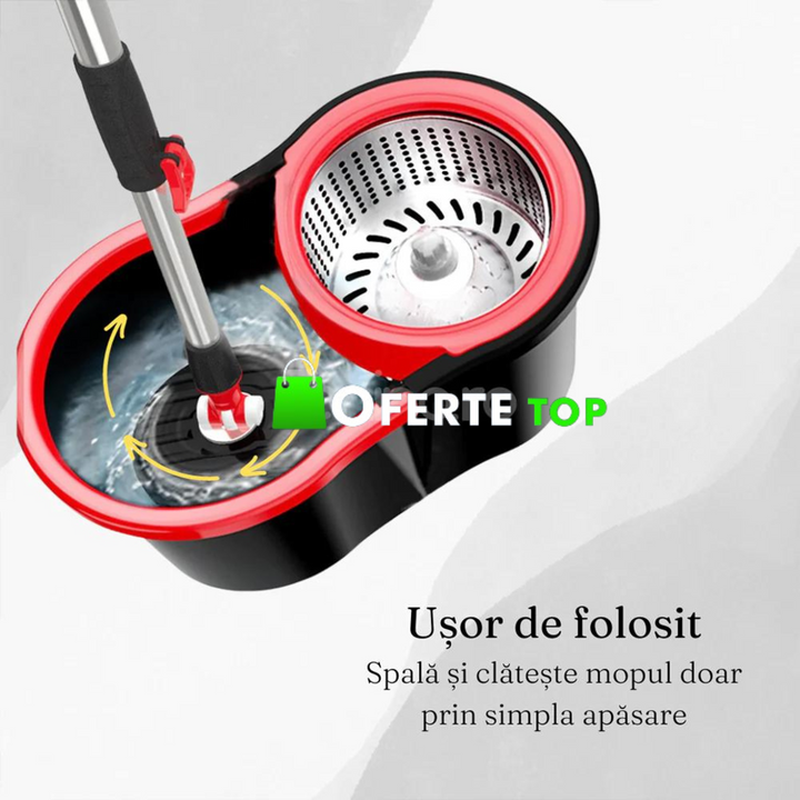 Setul Mop Rotativ vine cu un sistem de stoarcere inovator care permite sa stoarceti mopul fara sa va murdariti mainile. Acest lucru face ca mopul sa fie mereu gata pentru a curata si sa va economisiti timpul si energia.