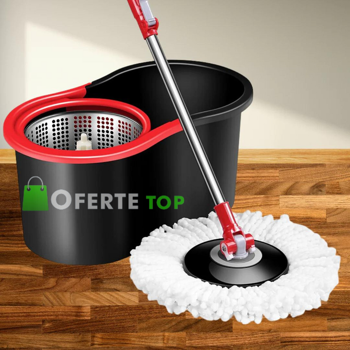 Setul Mop Rotativ are un aspect modern si atractiv, cu combinatia de culori neagra si rosie. Acesta nu este doar un instrument de curatare eficient, ci si un element decorativ pentru casa dumneavoastra.