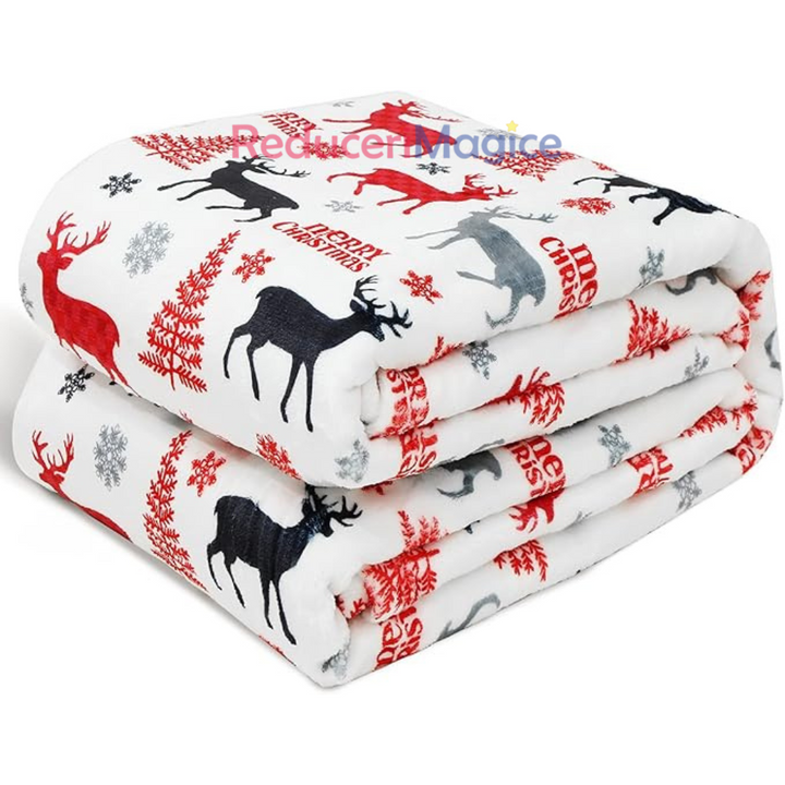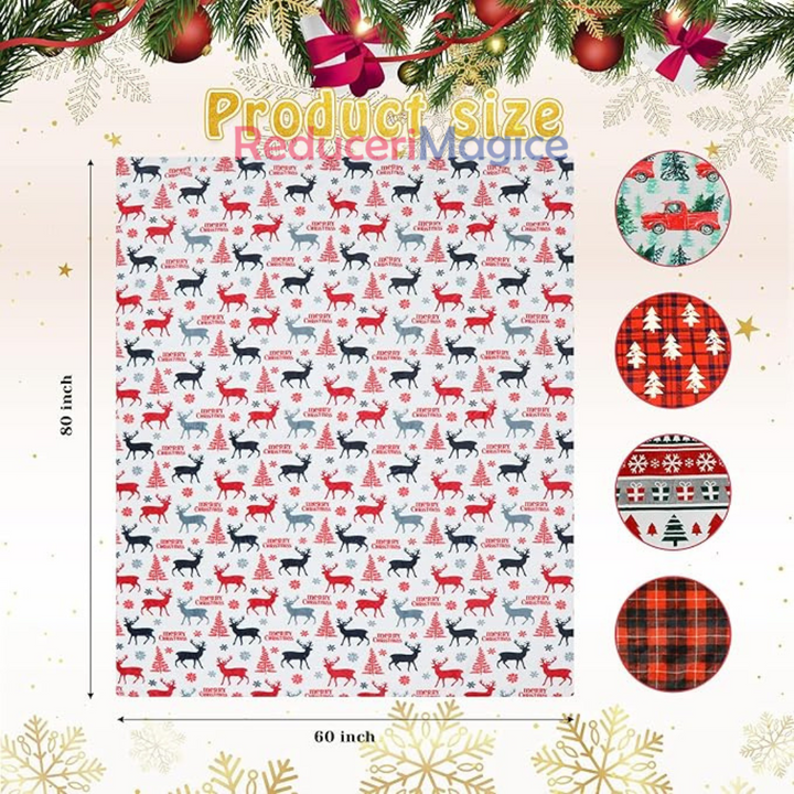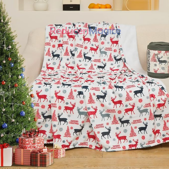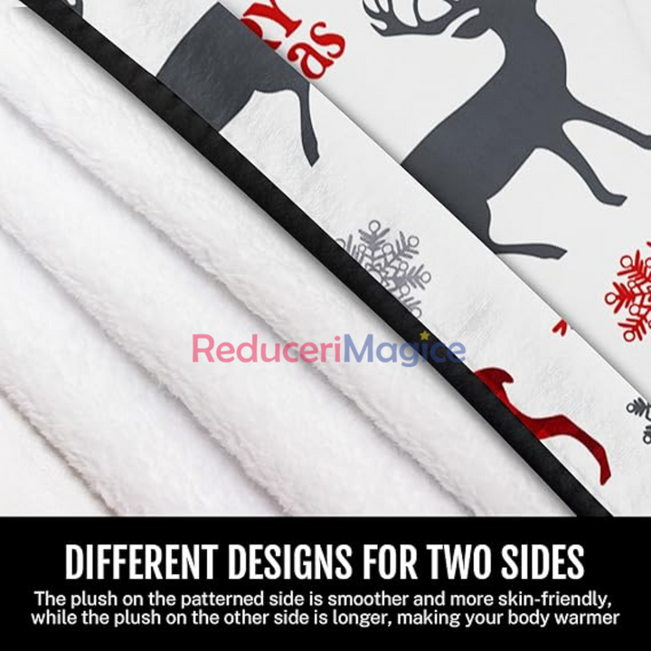 Design Festiv cu Modele de Crăciun – Pătura este decorată cu motive tradiționale de Crăciun, aducând un plus de spirit festiv în orice încăpere. Modelele includ reni, fulgi de zăpadă și brad de Crăciun, perfect pentru a crea o atmosferă caldă și primitoare.