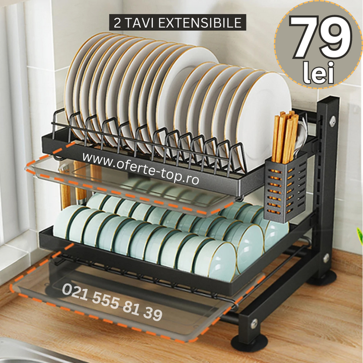 Cu un design elegant in culoarea neagra, acest scurgator de vase adauga o nota de stil si modernitate in bucataria ta. Suportul de scurgere automata asigura ca nu mai este nevoie sa toci manual apa, facilitandu-ti munca si economisind timp.