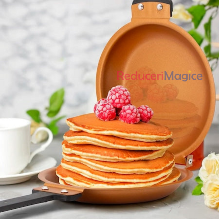 | Faceti clatite pufoase si delicioase in fiecare zi in mod rapid si usor cu tigaia. Pentru aceste tigai antiaderente de calitate nu este nevoie de unt, asa ca nu doar clatitele tale vor avea un gust grozav, ci vor avea un continut scazut de grasime. Doar turnati continutul in tigaie, inchideti si rasturnati. Acum clatitele tale vor iesi mereu perfecte. Tigaia nu este doar pentru clatite, puteti face omlete pufoase, toast frantuzesc fantastic si multe altele. | |